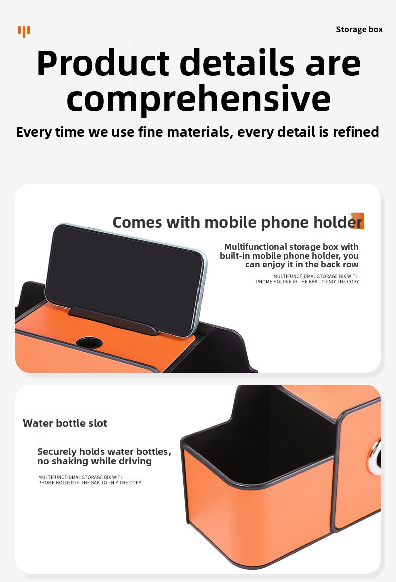 • Multifunctional Design: Combines storage compartments, cup holder, and accessory pockets in one sleek unit.