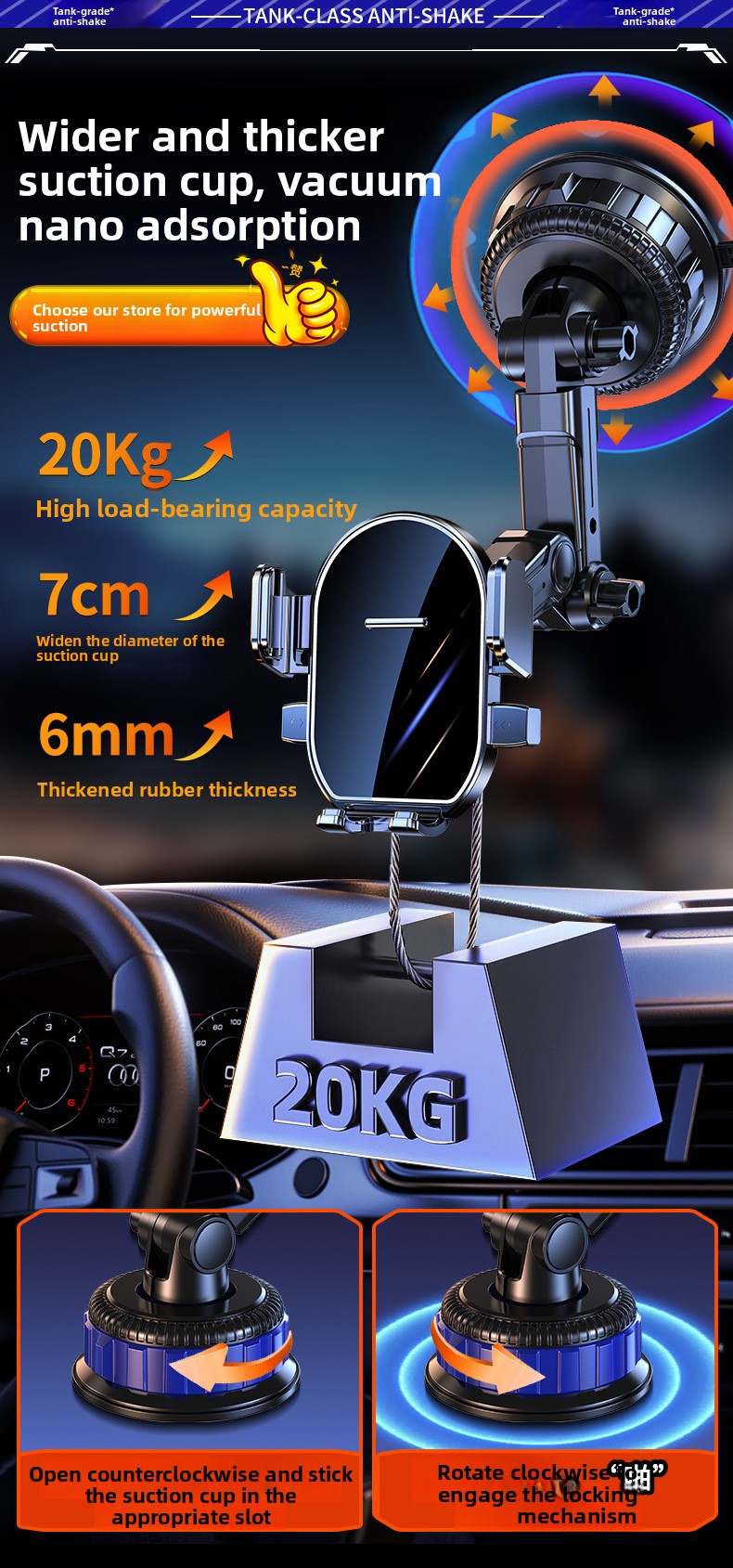 Built with durable HIPS (High Impact Polystyrene) and a dual-color injection molded design, this phone holder offers impact resistance, lightweight performance, and long-lasting durability. The shock-absorbing structure helps minimize vibration while driving, protecting your device from slipping or shaking.